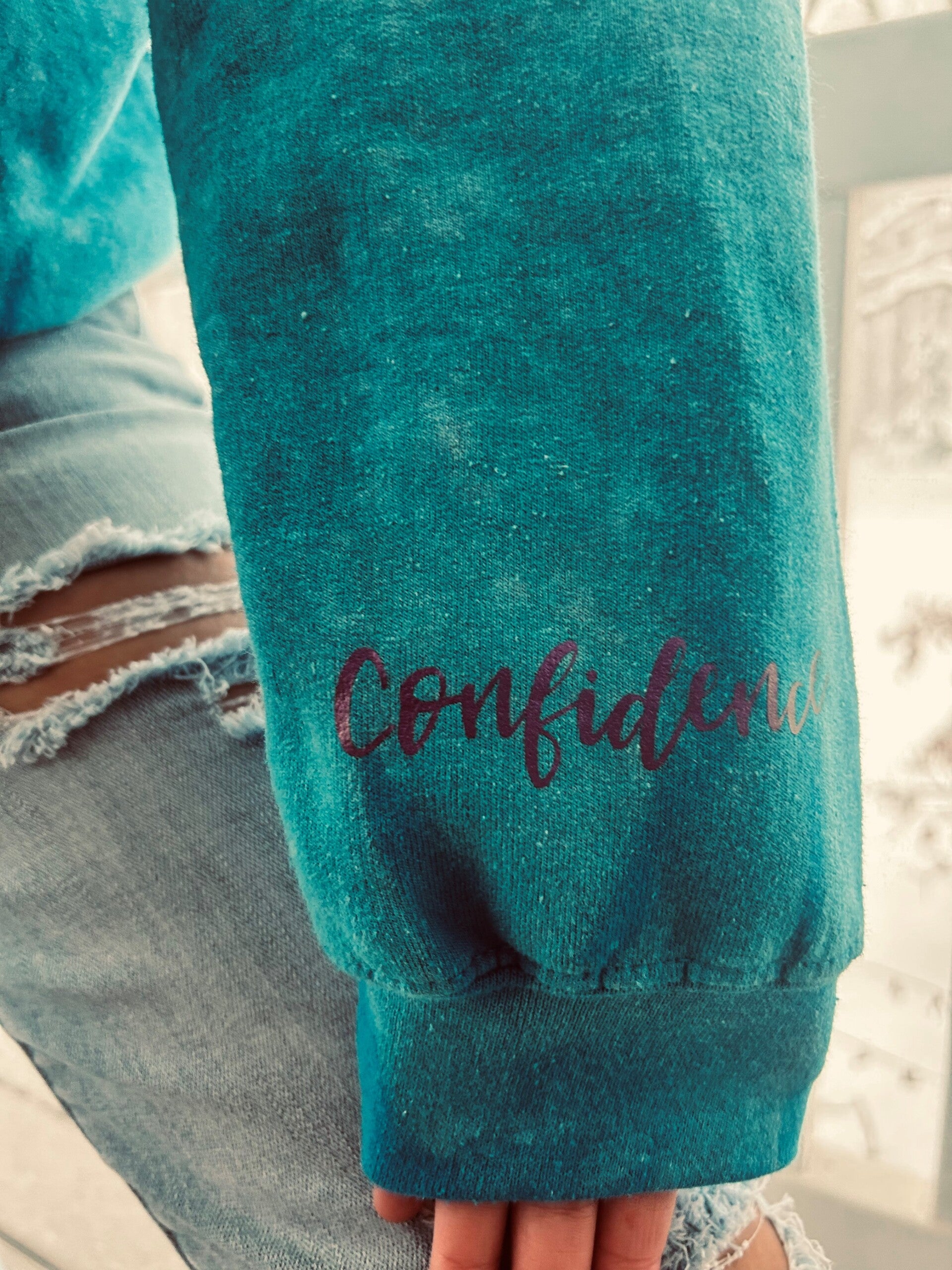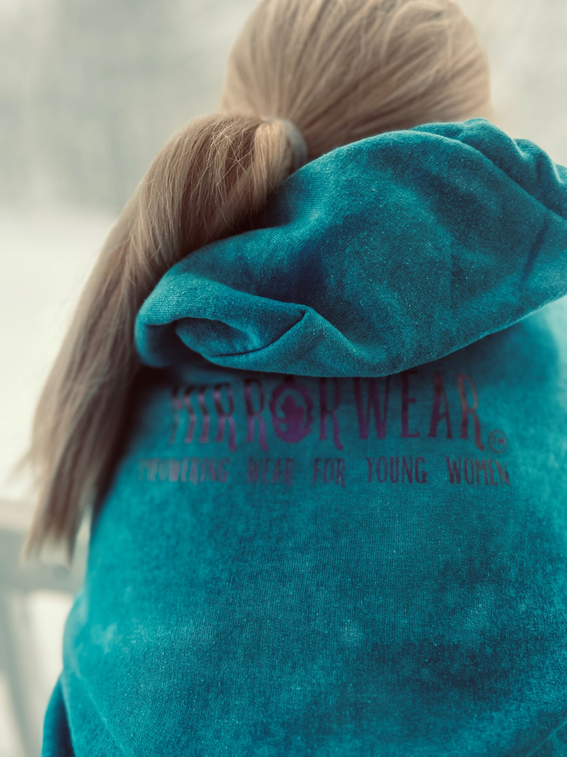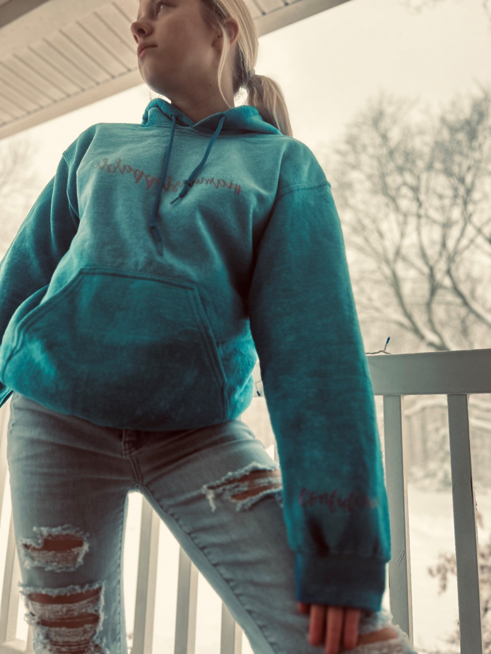 Our splashed bleach blue hoodie with standard metallic purple vinyl (*vinyl color may slightly vary based on availability and bleach splash result may vary). Inlcude your personal #iam message (printed backwards on chest) for your hoodie, (examples include, #iamstrong, #iambeautiful, #iamunstoppable) in the "REMARKS" section on the "CHECK ORDER/CONFIRMATION" page.